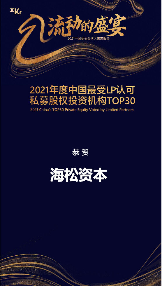 海松资本脱颖而出,荣获「2021年度中国最受LP认可私募股权投资机构 TOP30」奖项。