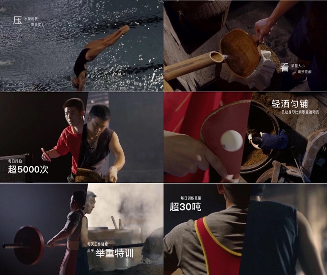 同样在泸州老窖发布的奥运短片中,我们也能看到其精神内核“为中国荣耀干杯”的投射。例如将打乒乓球、跳水和举重过程中的动作分别与酿酒技艺相呼应,在奥运被迫延期的语境下,十年磨一剑的运动员也如陈年美酒一样,在奥运赛场上一鸣惊人。