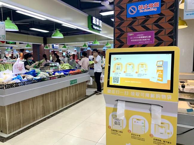 据悉,每台自助取袋机内可放置300个可降解环保购物袋,每名消费者每天可免费领取3只环保购物袋,能基本满足使用需求。自助取袋机整个操作为无接触式领取方式,不仅保障消费者安全,也进一步降低经营户和市民购袋的开销,受到大家的一致好评,在一定程度上也推进了市场智慧升级改造工作。