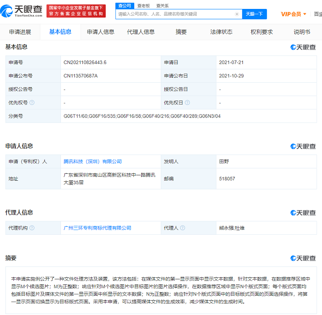 天眼查App显示,10月29日,腾讯科技(深圳)有限公司公开一项“ 一种文件处理方法及装置 ”专利,公开号为CN113570687A,申请日期为2021年7月21日。