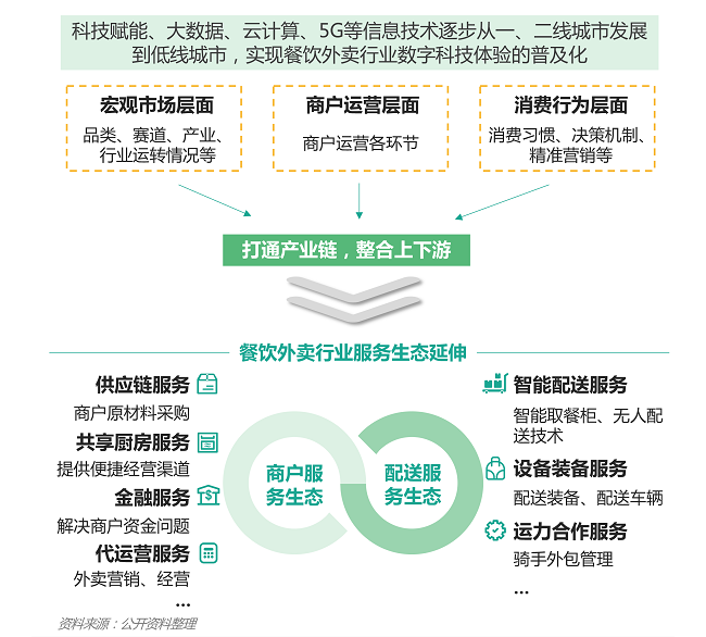 • 随着互联网平台对餐饮外卖行业的持续渗透,并加快对下沉城市的覆盖进度,大数据等数字技术使餐饮外卖产业从供给侧到消费侧的上下游信息被彻底打通,实现整合优化;而随着产业上下游的整合,越来越多的服务模式加入到餐饮外卖产业中,实现餐饮外卖产业的生态边界持续扩大、行业生态产业链日益庞大。