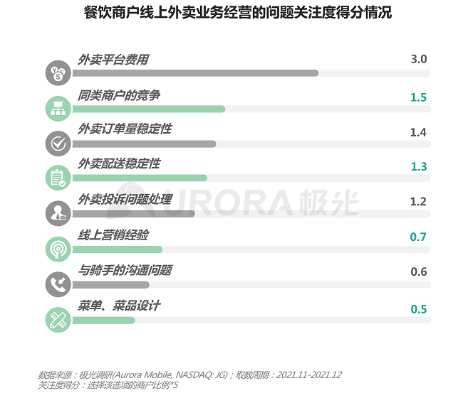 极光调研显示餐饮商户在经营线上外卖业务时,最关注的前三个问题是外卖平台费用、同类商户间的竞争以及外卖订单的稳定性;其次,外卖配送的稳定性、投诉问题的处理等也是商户们在经营中比较关心的问题。