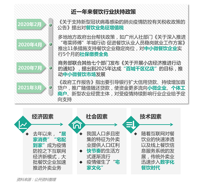 • 自去年疫情发生以来,针对餐饮行业的复苏与稳定,各级政府出台了有力的相关政策,涉及税收减免、社保费减免、金融贷款支持等多方面,全力保障中小餐饮企业顺利渡过疫情期,实现市场的可持续健康发展;在经济、社会、技术多重利好因素的作用下,我国餐饮外卖行业发展脚步依然稳健有力。