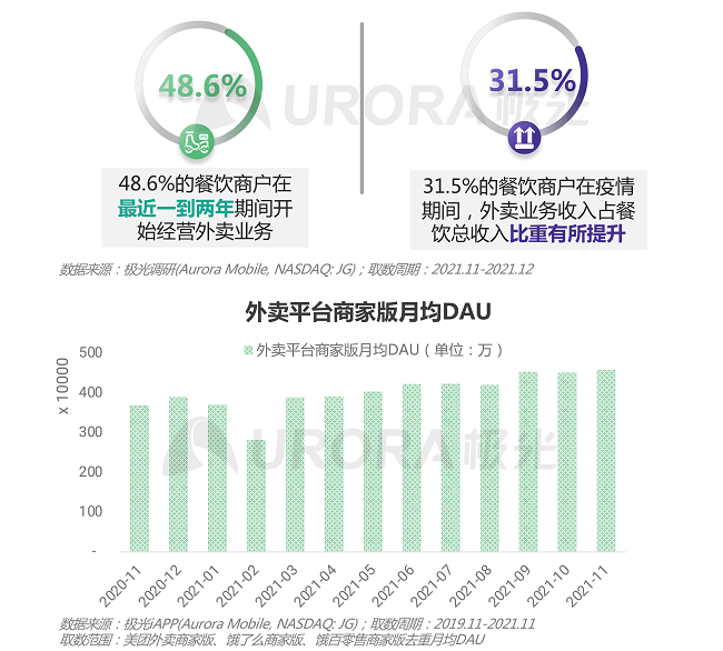 • 线上外卖平台商家版月均日活跃用户保持上升趋势,今年11月,外卖平台商家版月均DAU达近一年来的峰值。