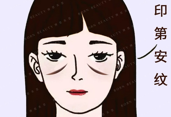 印第安纹又称颧颊沟,指的是颧骨下侧因颧骨韧带及周边肌肉松弛发生的皱纹,是眼底部位出现凹陷或形成斜线形态的皱纹。印第安纹常会被误以为是泪沟的延长。实际上是这个位置,眼下的横纹,靠近颧骨两侧,跟泪沟的位置是不一样的。有时候会因为这两条横纹而感觉脸肉横生,观感不善。印第安纹不仅给人一种强势、生气的感觉,从美观上讲还有些显老。