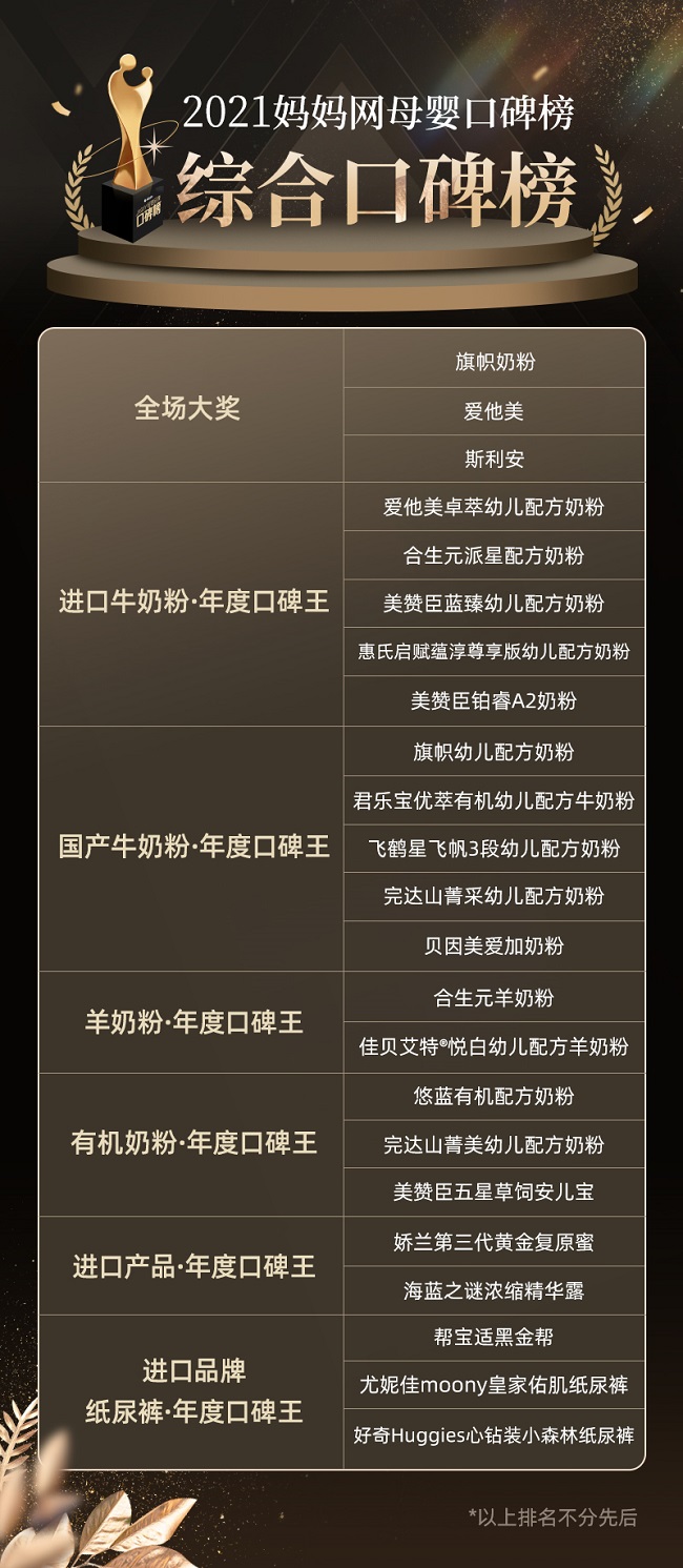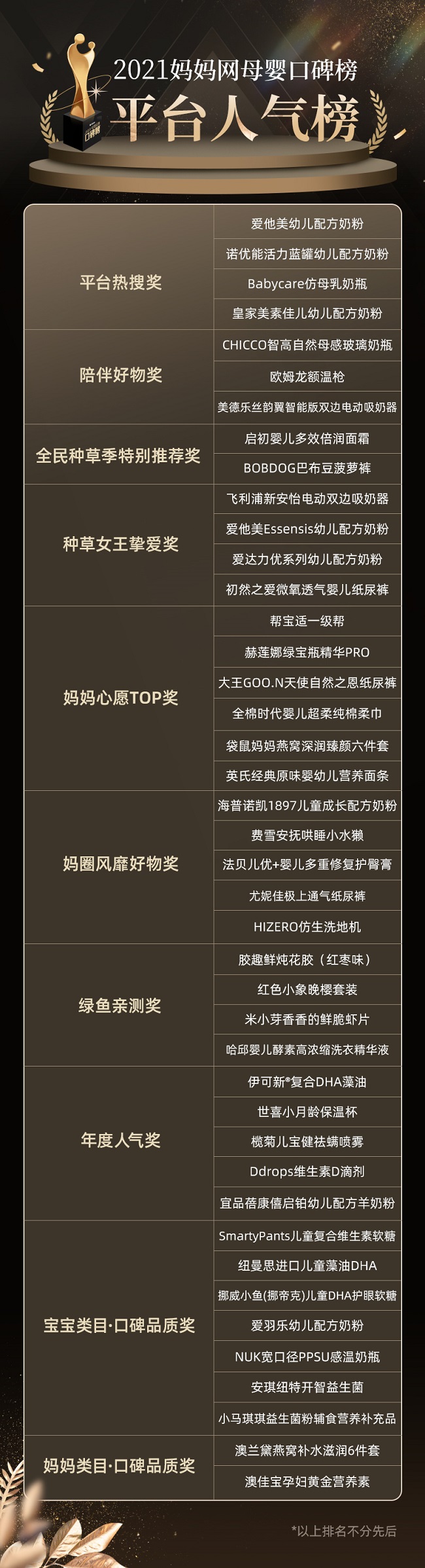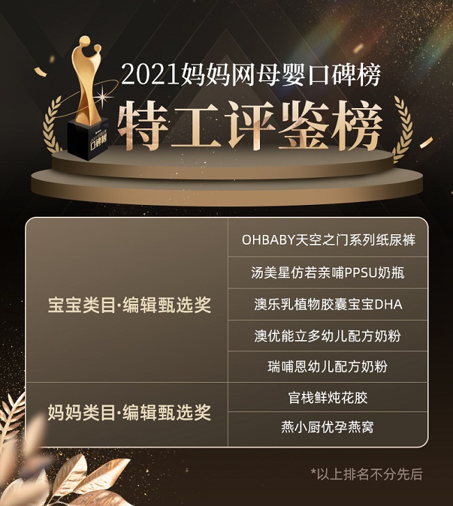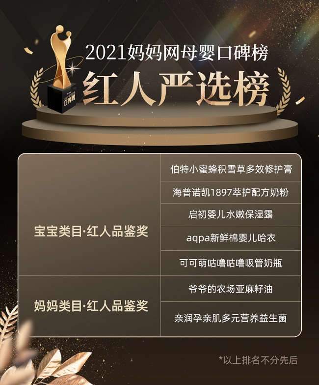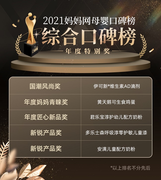 12月28日,受到业内和母婴群体高度关注,在行业内最具影响力与权威性的母婴盛典——妈妈网·2021母婴品牌口碑榜落下帷幕,在经历了大众评审、专业评审、最终评审三大阶段评选之后,榜单重磅揭晓,超百款母婴尖货凭实力上榜。