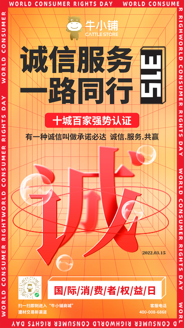 感恩一路同行,在今年“3·15”国际消费者权益日到来之际,牛小铺甄选百家深度合作伙伴,献礼“十城百家”优质诚信商铺,以此感谢长久以来的深度合作与信任。同时号召全体合作商户文明经营、诚信立业,为共铸建材行业诚信服务体系作出积极贡献,进而为广大消费者持续创造“安心、省心、放心”的服务体验。