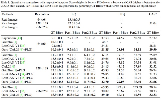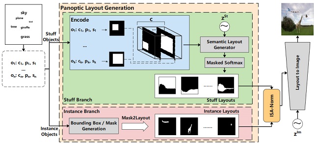 Instance分支采用通常的做法,先同时生成位置方框和形状,然后将其组合成实例布局(Instance Layout)。对于Stuff分支则使用全新的做法,直接生成填充布局(Stuff Layout),由于此结果是直接由模型通过Softmax层得到,其在整个图像空间上,不会有空缺部分,以此来解决“区域缺失”问题。因为对于不可数类别,其形状也不是固定的,这种整体生成的方式对于类别识别来说,不会带来很大的影响。分别生成的两个布局,可以通过ISA-Norm层来聚合到一起,形成最后的布局(Layout)。从布局(Layout)到最终的图像生成,我们采用SOTA模型CAL2I[2]方法,得到最终的合成图像。