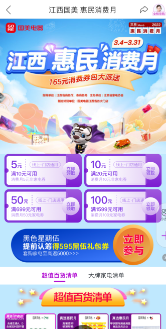 大家都知道,要想吸引消费者,低价是最大“杀器”。但价格是由市场和供应链来决定的,任何平台都不想“赔本赚吆喝”。那么本次3.26惠民内购会,江西国美如何实现“真低价”呢? 首先在3.26惠民内购会活动期间江西国美选择发放海量满减优惠券,非家电商品可用满10元减5元,满20元减10元,购买日用百货可能会有意想不到的惊喜低价。