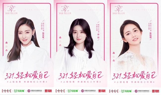 “让女性更懂自己,让女性更爱自己”是“321粉红三叶草”公益活动创办以来一贯的价值主张。今年的“321粉红三叶草” 公益大使,由乔欣、张天爱、陈钰琪三位女姓明星担任,作为公众人物,他们希望能够作出表率,更勇敢、更无畏的挺身而出,号召女性朋友们不要害怕疾病、更不要羞于表达。
