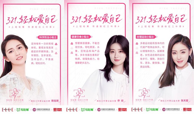 当下,乳腺癌、卵巢癌、子宫内膜癌并称为女性群体最为高发的三大癌症,但由于社会重视度不够,许多女性又往往因为羞于启齿,错过了最佳治疗时期,导致了悲剧的发生。2022年3月21日,轻松筹、中国妇女发展基金会、公益时报、ELLE联合发起了“321粉红三叶草”公益活动,以“321,轻松爱自己”为主题,力邀乔欣、张天爱、陈钰琪三位女性公益大使,共同呼吁关注女性癌症预防。