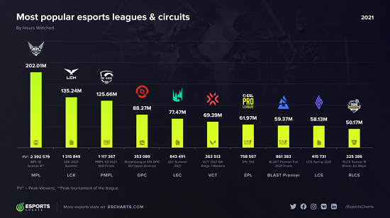 面对海外MOBA市场的激烈竞争, 2016年上线的MLBB依然保持高速发展。2021年,MLBB全球下载量超10亿次,月活用户突破1亿。除了在东南亚地区保持极高的市场占有率外,2021年MLBB在拉美、欧洲、中东、大洋洲等地区也呈现出持续增长趋势。在游戏产品不断受到市场认可的同时,沐瞳围绕MLBB打造的电竞赛事也获得了不俗的成绩。据三方数据平台统计显示,在2021年全球移动电竞观看时长排行榜中,MLBB相关职业赛事以3.86亿小时总观看排名第1。同时MLBB职业电竞联赛成为2021年收视率排行最高的职业电竞联赛之一。
