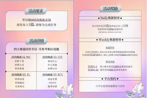 2022年3月17日至4月13日期间,小红书通过“时尚焕新企划”面向不同粉丝量级的时尚博主全新开启四大内容赛道,解锁新的内容扶持机制、新的签约机会、新的时尚创作课程。此次企划提供过亿流量资源,采用全新机制大力扶持图文与视频创作者。