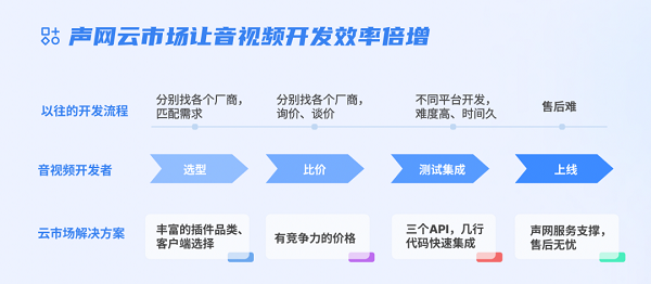 以往,音视频开发者需要花费大量的时间选型、比价、测试、集成音视频能力,导致应用的整体开发周期较长。现在,开发者可以在声网云市场上一站式进行选型、比价、测试、集成各类音视频插件,通过 3 个标准 API, 快速集成音视频扩展能力,之前可能需要 120 个小时开发的项目能缩短至 2.5 个小时,节省了 95% 的集成时间,轻松构建丰富多样的音视频场景,让开发者更加专注于业务逻辑和用户体验。